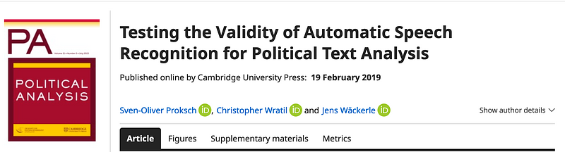 Proksch, Sven-Oliver, et al. “Testing the Validity of Automatic Speech Recognition for Political Text Analysis.” Political Analysis, vol. 27, no. 3, 2019, pp. 339–59.